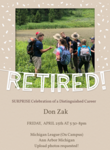 Several past and recent lab alums were able to surprise Don with a retirement Party on April 25th. His official retirement isn’t until the end of May, but being sneaky we had a party early. Don started working as a professor at the University of Michigan for the then School of Natural Resources & Environment in 1988. He has remained a embodied a true professor as not only a celebrated scholar but also a dedicated educator. During his time at Michigan he has won received numerous honors, both for science and teaching, a weathered several Deans and name change to the School for Environment and Sustainability and attended way too many faculty meetings. He taught several courses in both the lab and field, authored/co-authored more than 200 journal articles, contributed and authored chapters in several academic books, was a PI or co-PI on grants totaling more than $21 million dollars, advised more than a dozen post-docs, chaired 16 PhD and 21 MS students to completion. All while raising a family, whom have families of their own now. This seems to boil down his career at the University of Michigan in a few sentences, but the dedication and scholarly achievements that Don has shown cannot be seen in this post. He’s helped so many students attain their goals by being a true mentor to them. His energy and insight will be missed on campus, but he’ll always be an academic and scientific thinker no matter what. Thank you Don from all the people who’s lives you helped guide and for all the wonders of science you lead others to love and understand ...